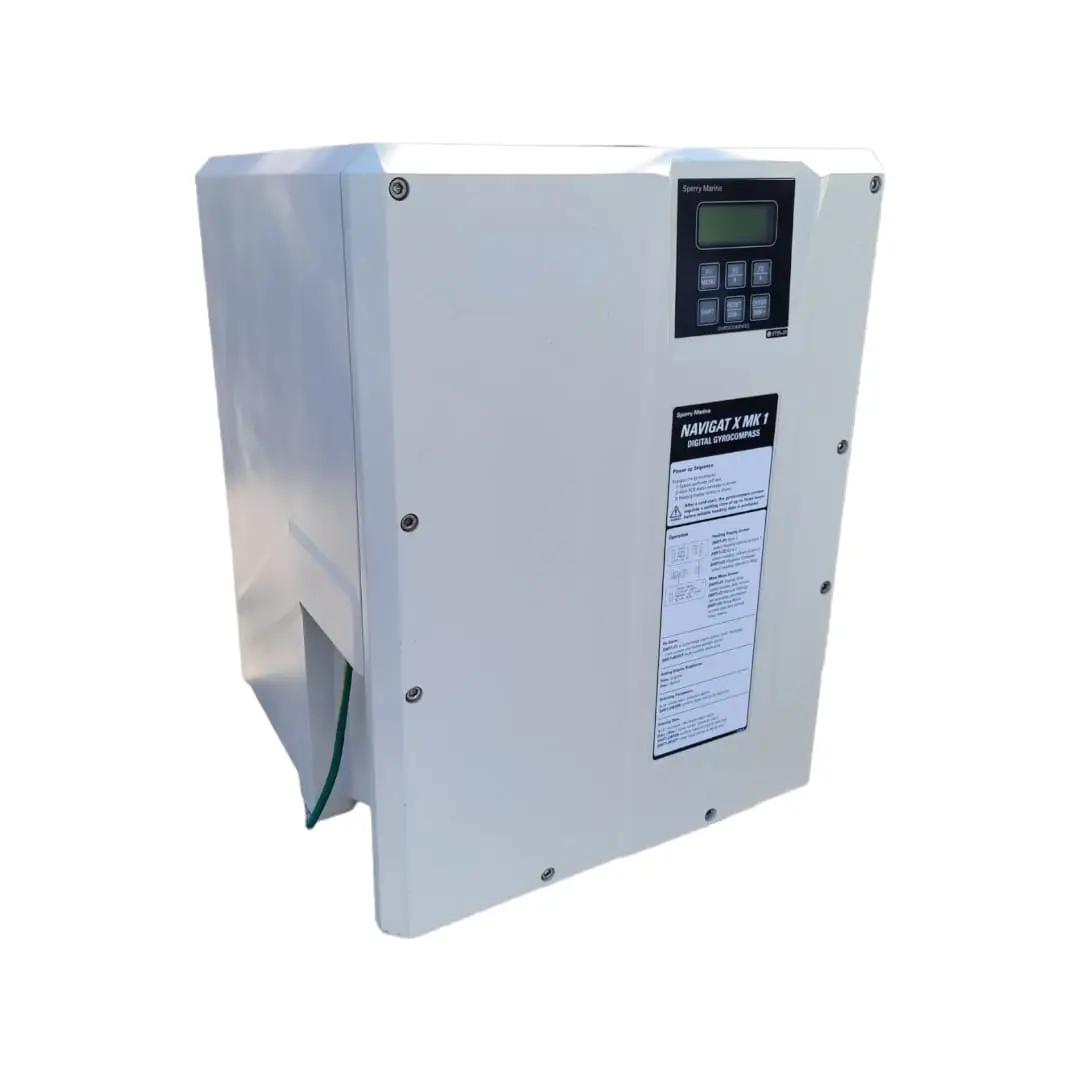 Product Description: Gyrocompass navigat X MK1 provides highly accurate heading information in extremely heavy seas. The system is equipped with a special gyrosphere container, with a unique centering pin retaining arrangement that is mounted in an additional gimbal system. This allows an almost unlimited freedom of roll and pitch (±90°). Key Benefits of Gyro Compass NAVIGAT X MK 1 – Complies with IMO regulations A.424(IX), A.694(17), A.821(19) – High-Speed Craft (HSC) and ISO 8728. – Comprised of one single unit. – Type-approved rate-of-turn output. – Gyro system remains north stabilized during power interruptions of up to 3 minutes. – Short maintenance and repair times – low service costs.